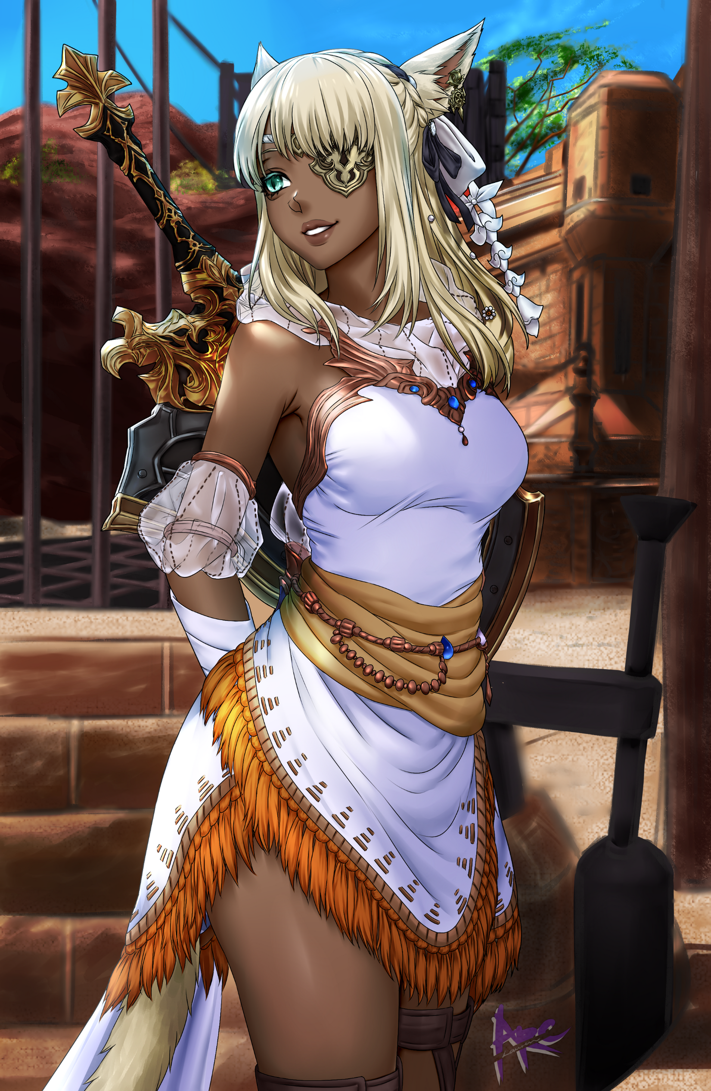 Playful, sarcastic, flat-toned, and dead-pan, Fah mixes thought-provoking dialogue with action. Committed to protecting the weak at the expense of herself, she may find better company among Dark Knights than other Paladins.Fah's origin, tribe, birth name, and birth place are unknown. She was found abandoned on the steps of Ul'dah and adopted by an elderly elezen woman.Her adoptive mother having been a retired Ishgardian knight-dragoon, she instilled strong values and an excellent fitness regiment on her daughter. This led to Fah joining the Gladiator's guild and later winning an apprenticeship within the Sultansworn in a tournament within the Blood Sands.Her life fell apart years later when she committed insubordination and was expelled from the Sultansworn and was imprisoned. Her sentence was commuted however, due in large part to her former teacher within the Sultansworn.She continues to compete in the Blood Sands and takes on quests at the Adventurer's Guilds, as well as part-time as a sword instructor.